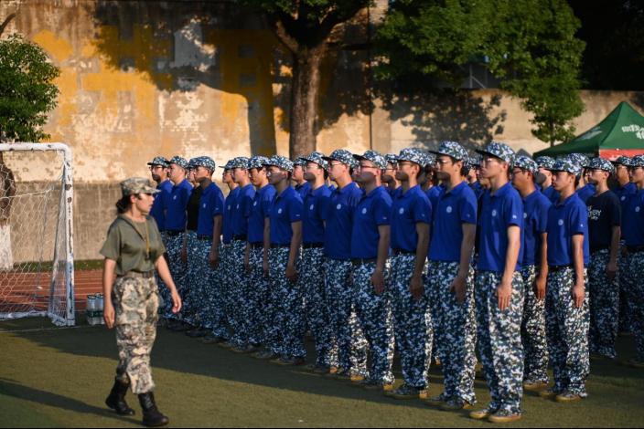 朝阳初升,麓南校区的训练场已被阳光晕染。军训第二天依旧在灼热中拉开序幕。当迷彩服浸透了更深的汗渍时,我们读懂了这堂必修课更深层的意义。今天的核心课程是队列训练和拉红歌。站军姿,是对意志最纯粹的磨砺。烈日下,我们如松挺立,感受着汗水从额角滑落、在衣背汇流。每一秒的坚持都是对自我的超越,是精神的蜕变。齐步走训练则让我们真正理解了“团队”的含义——从最初的“单兵训练”到后来的节奏统一。当“一、二、一...